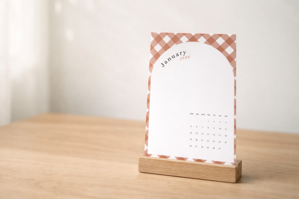 小さなイーゼルやスタンドに立てかければ、卓上カレンダーとして活用いただけます。